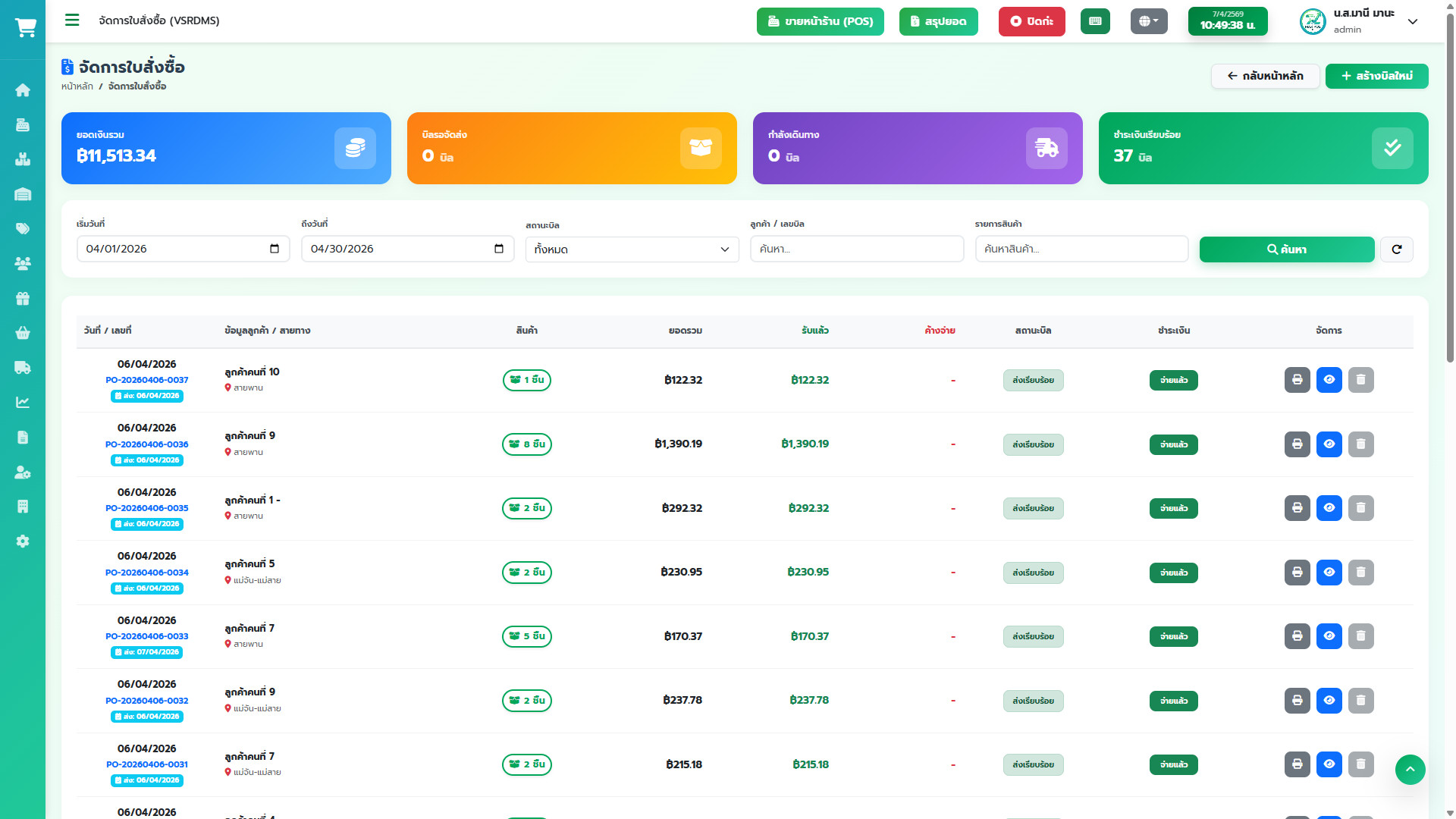 บิลใหม่ (สีเขียว): ออเดอร์ที่เพิ่งไปส่งวันนี้