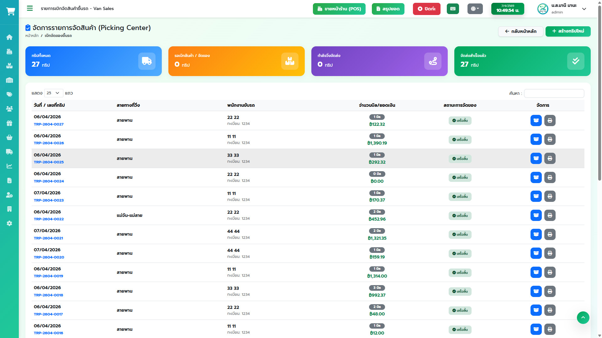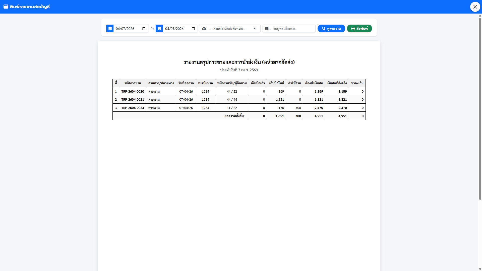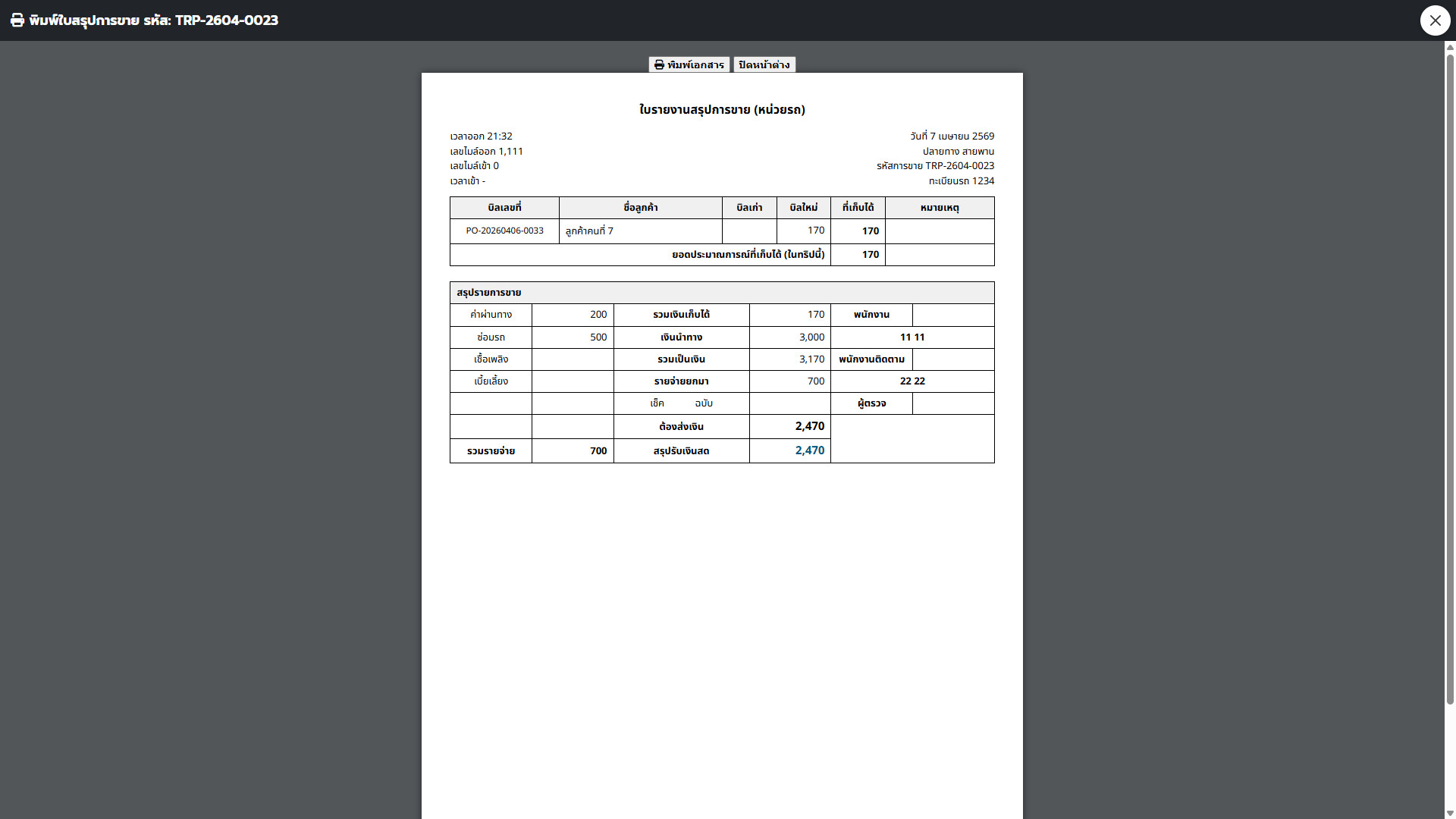 ใบสรุปการขายหน่วยรถ (Driver Trip Report): พิมพ์ใบปะหน้าให้คนขับรถถือไปหน้างาน เพื่อให้รู้ว่าวันนี้ต้องไปส่งใคร เก็บเงินใคร ยอดรวมเท่าไหร่ พร้อมช่องให้บัญชีเซ็นรับเงินตอนเย็น