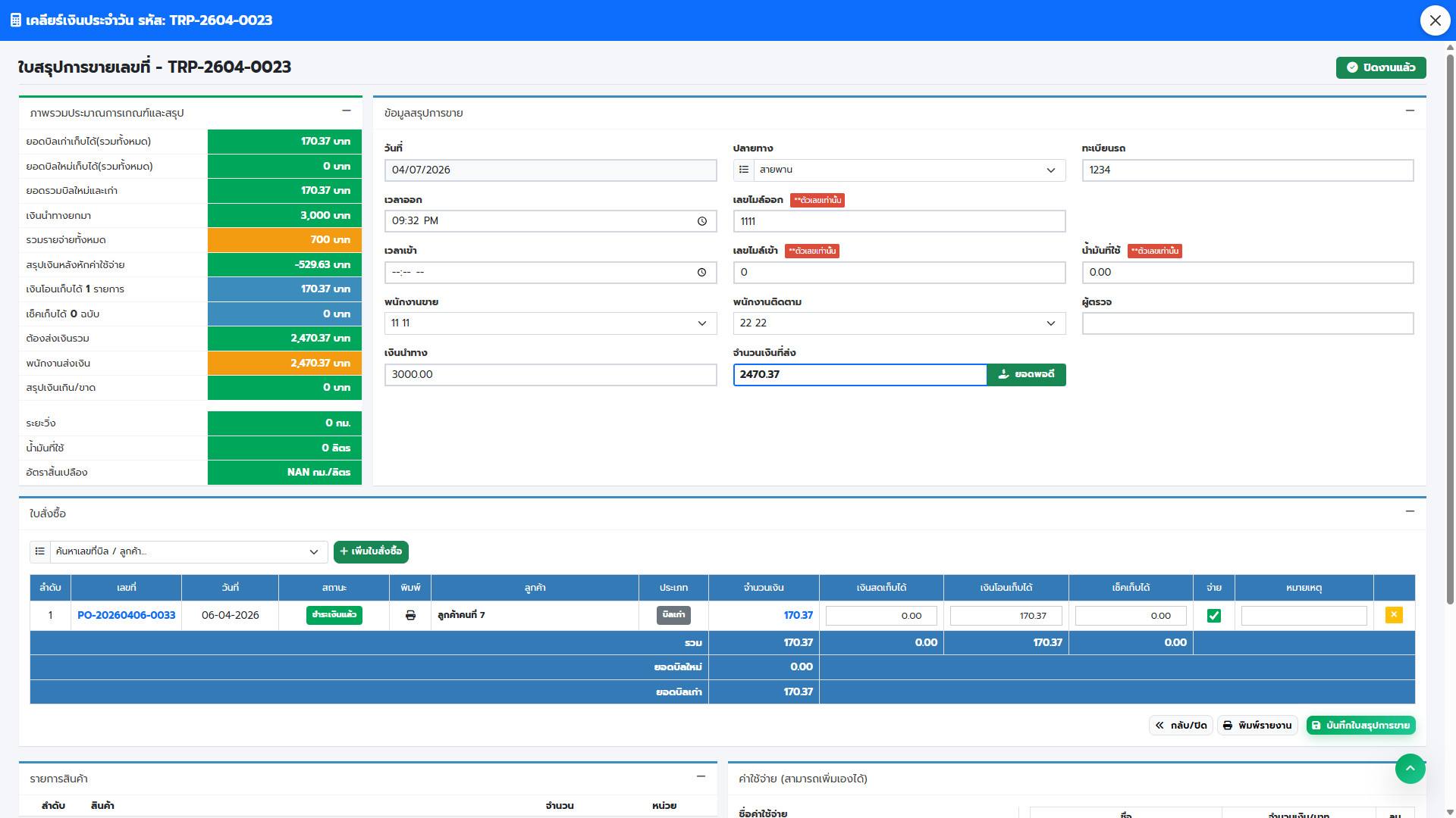 ระบบเงินทดรองจ่าย (Petty Cash/Float): มีช่องบันทึก “เงินนำทาง” (เช่น 2,000 บาท) เพื่อเป็นเงินทอนหรือไว้เติมน้ำมัน/กินข้าวระหว่างทาง