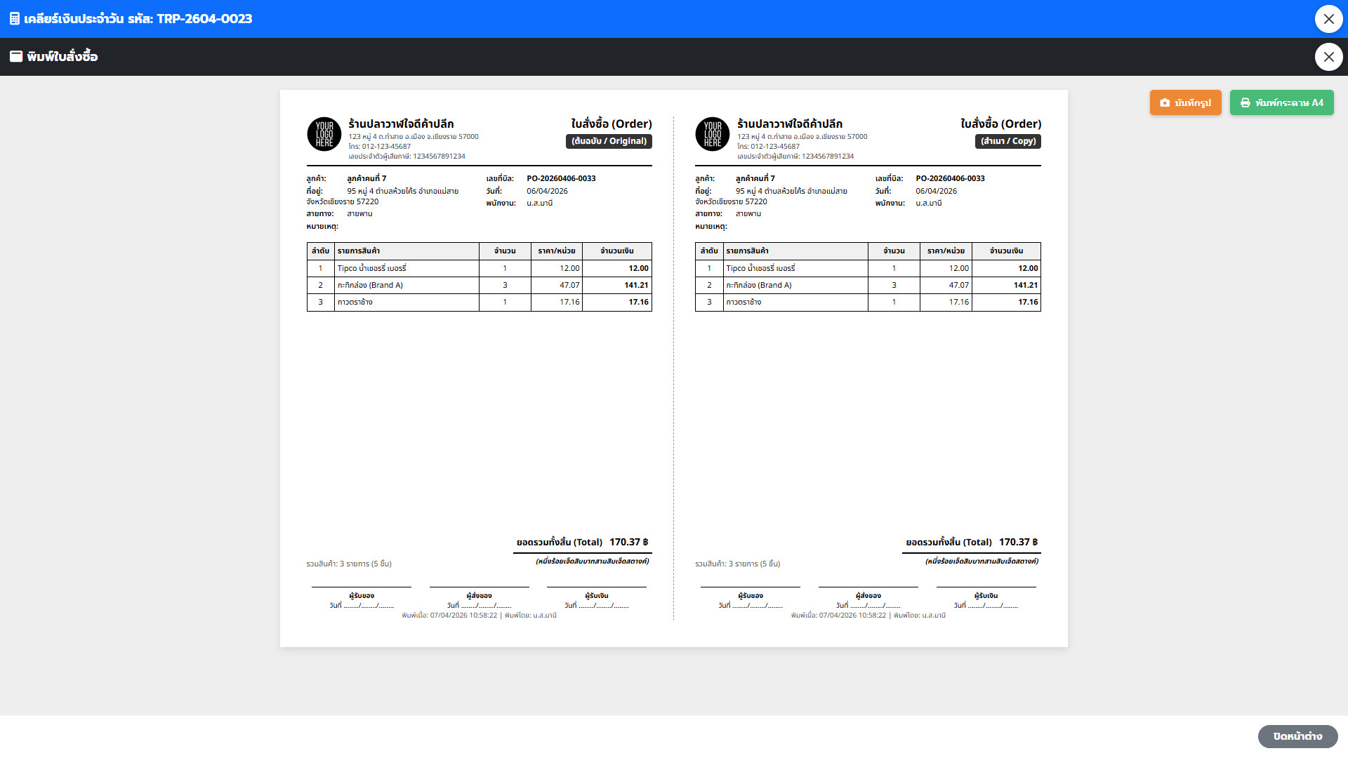 ใบกำกับสินค้า/ใบเสร็จรับเงิน: รองรับกระดาษต่อเนื่อง (Dot Matrix) หรือ A4/A5 มีการแบ่ง “ต้นฉบับ” และ “สำเนาคู่ฉบับ”